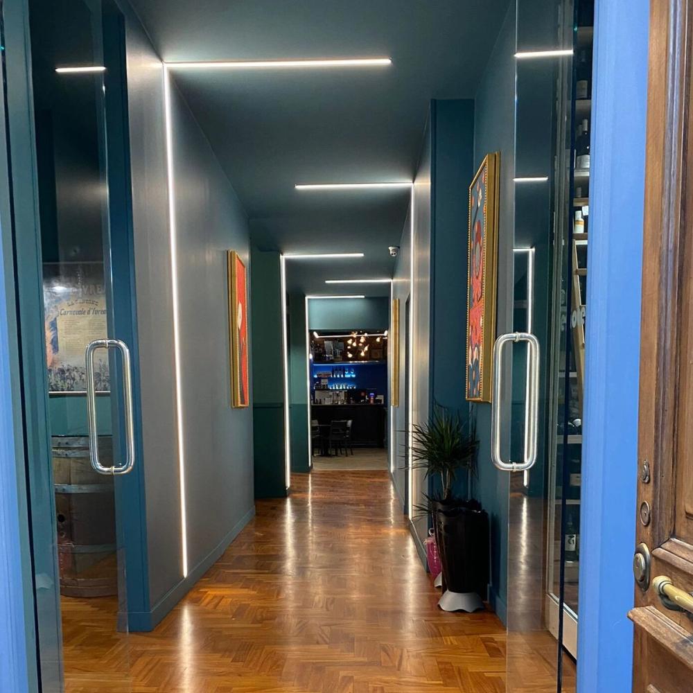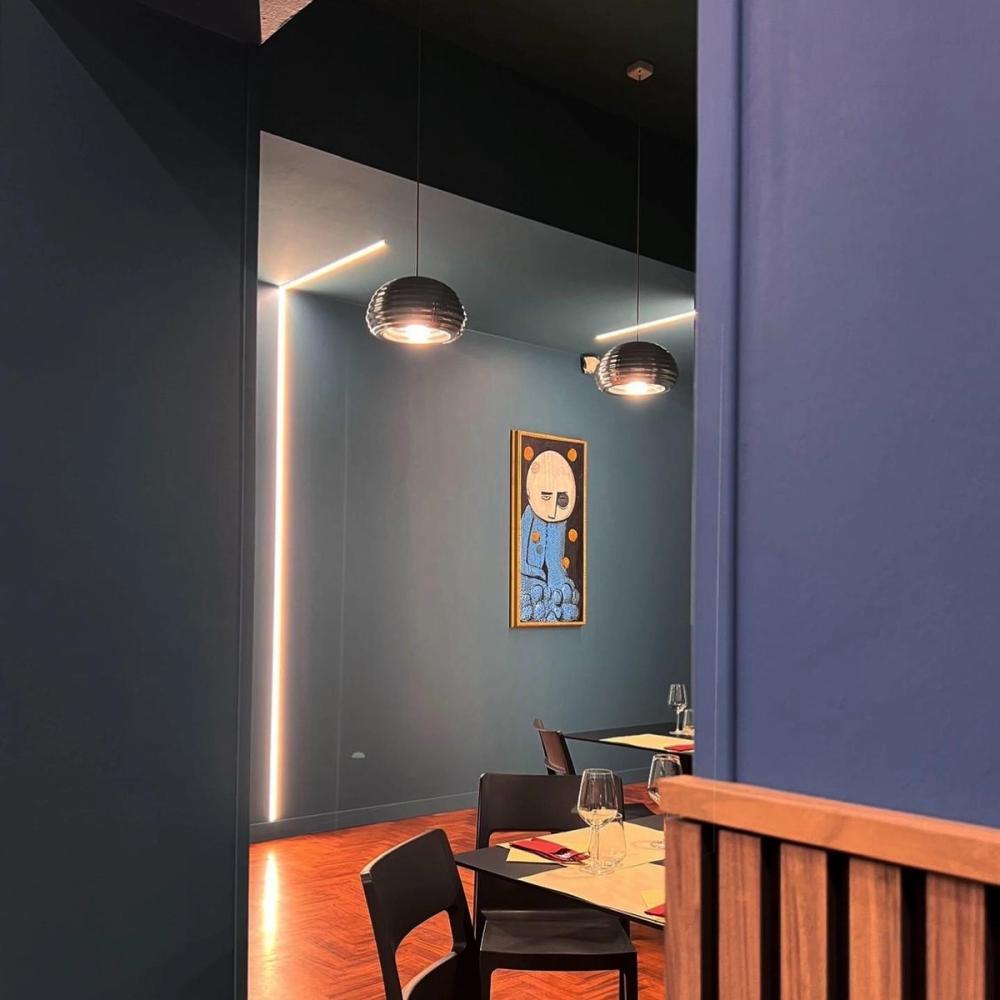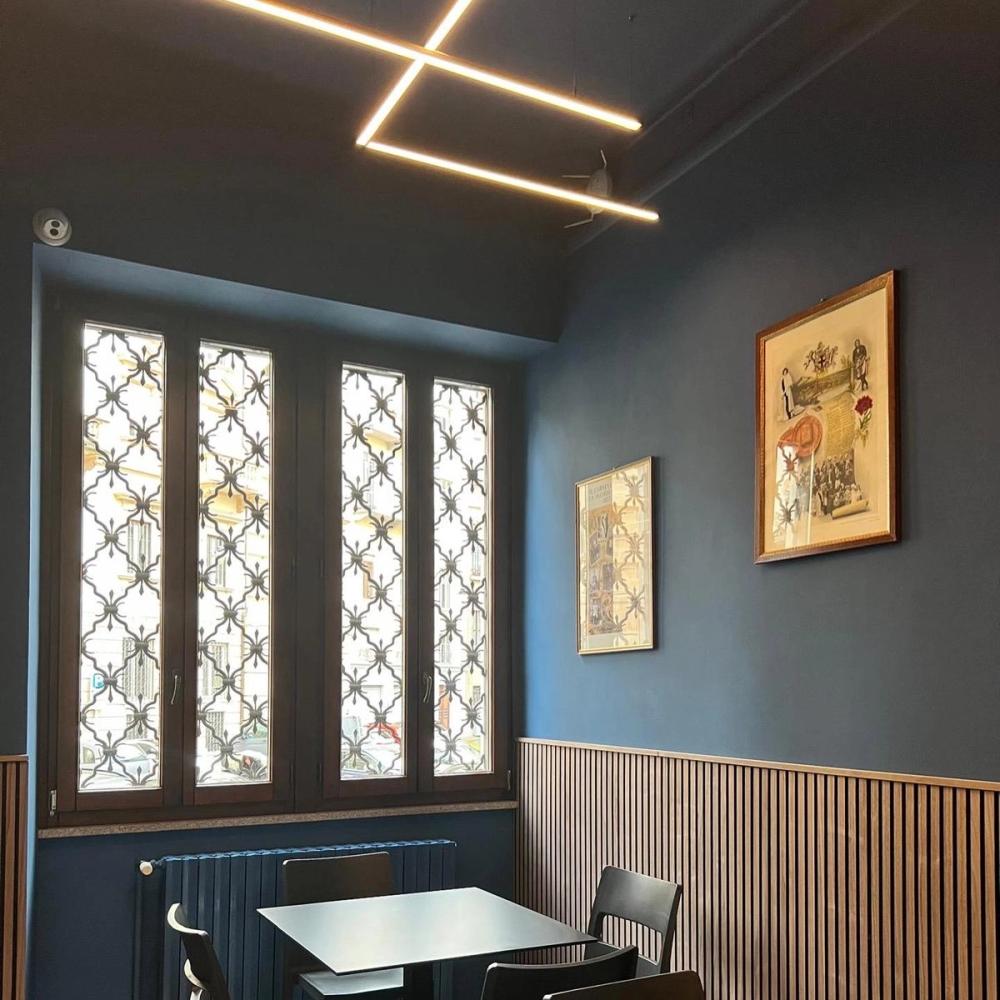 Progetto e realizzazione dell’illuminazione per bar e caffetteria, studiata per creare un’atmosfera accogliente e valorizzare il design degli interni.